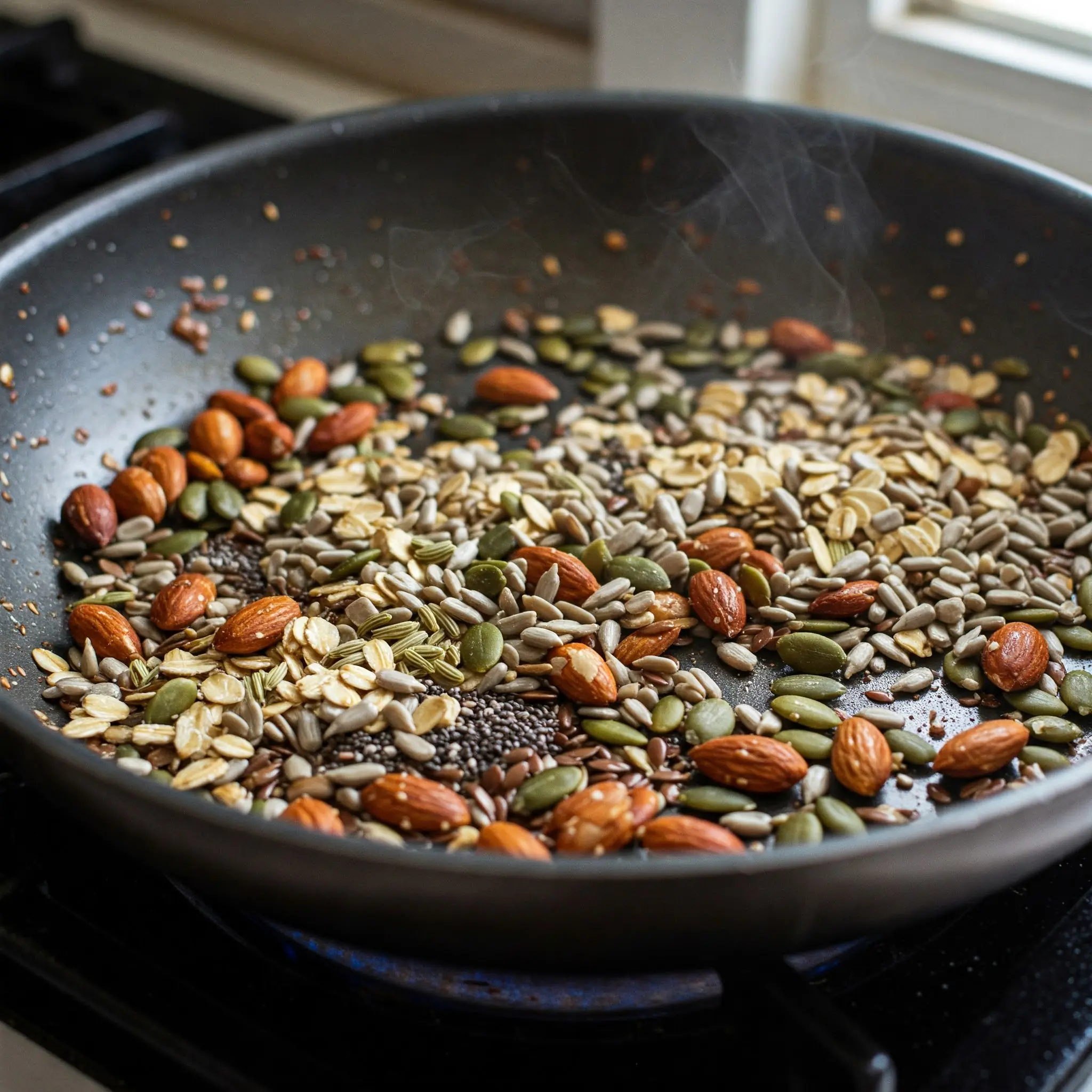 Begin by dry roasting the almonds, peanuts, pumpkin seeds, oats, sunflower seeds, fennel seeds, flaxseeds, chia seeds, and poppy seeds in a pan on low heat for about 5-7 minutes. Stir constantly to prevent burning, and roast them until they release a nutty aroma. This roasting process enhances the flavors of the ingredients and helps release their beneficial oils.