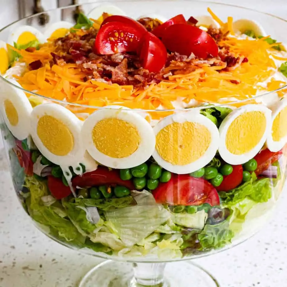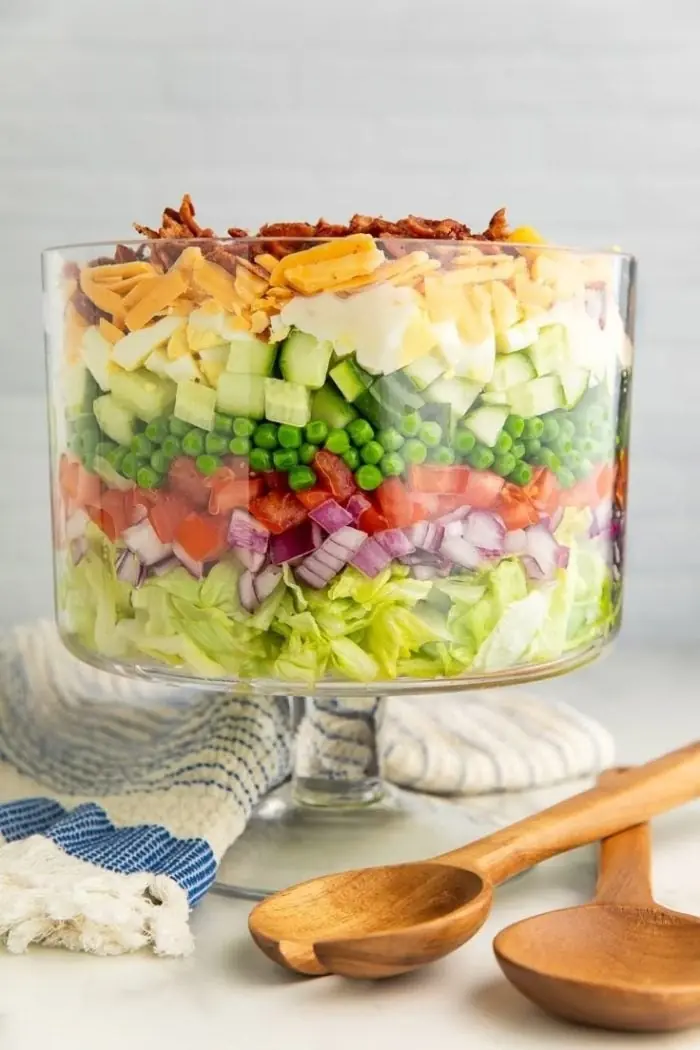 Seven Layer Salad is more than just a pretty dish - it’s a celebration of flavors and textures in every bite. The crisp freshness of the vegetables, the creamy dressing, and the smoky bacon come together in the most irresistible way.