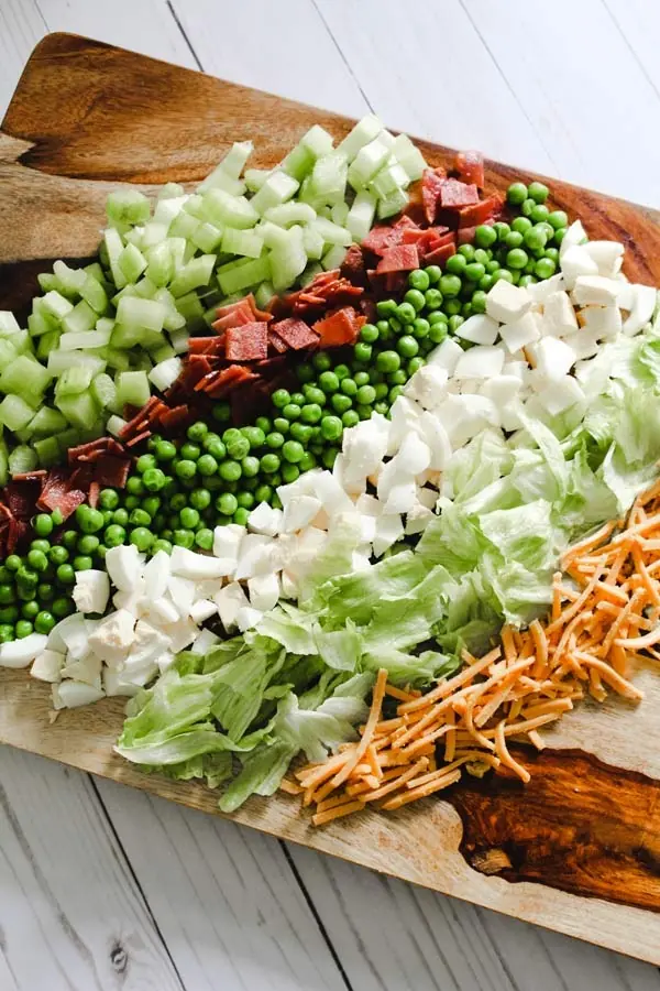 Because of the mayonnaise-based dressing, Seven Layer Salad does not freeze well. It’s best enjoyed fresh or within a couple of days.