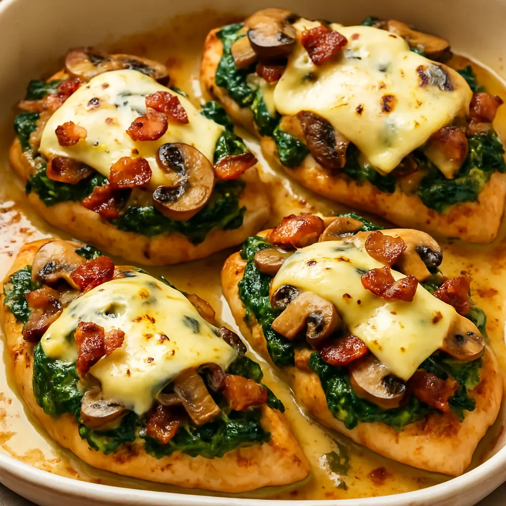 Once the chicken has finished baking, remove it from the oven. Top each chicken breast with a generous portion of the creamed spinach, followed by the chopped cooked bacon, sautéed mushrooms, and broken slices of Pepper Jack cheese. Place the baking dish back in the oven and bake, uncovered, for 15-20 more minutes, until the chicken is fully cooked, no longer pink in the center, and the juices run clear.