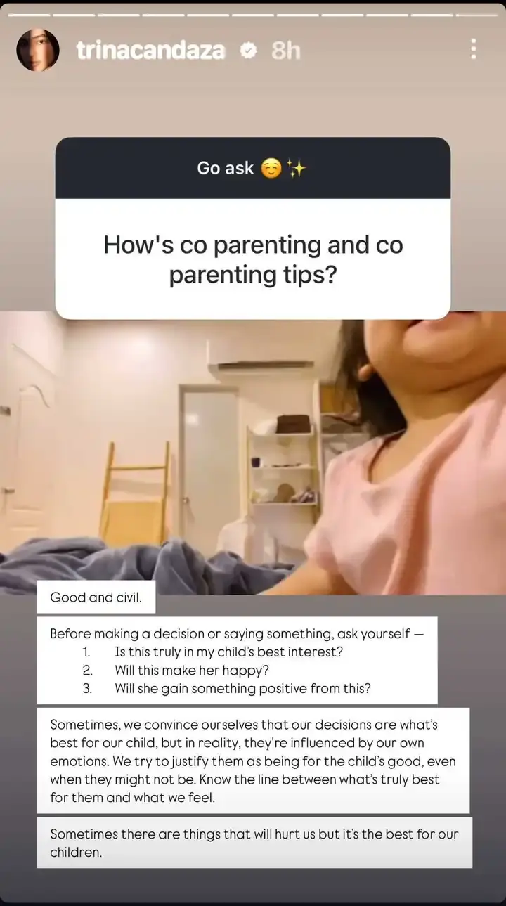 Trina Candaza, model, content creator, and hands-on mom, recently opened up about her co-parenting setup with her ex-partner, actor Carlo Aquino, during a Q&A session with her followers on Instagram. One of the questions she received from a netizen asked her about the dynamics of their co-parenting arrangement and any tips she might have for other parents facing similar situations.